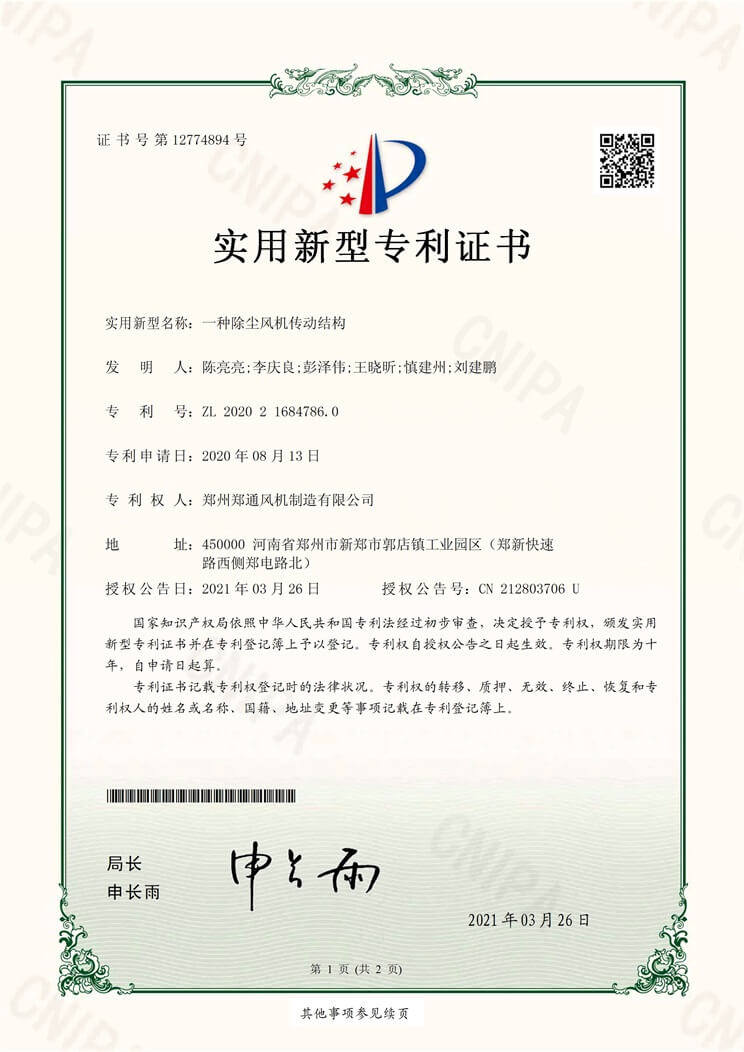 一種除塵風(fēng)機(jī)傳動(dòng)結(jié)構(gòu)實(shí)用新型專(zhuān)利證書(shū)