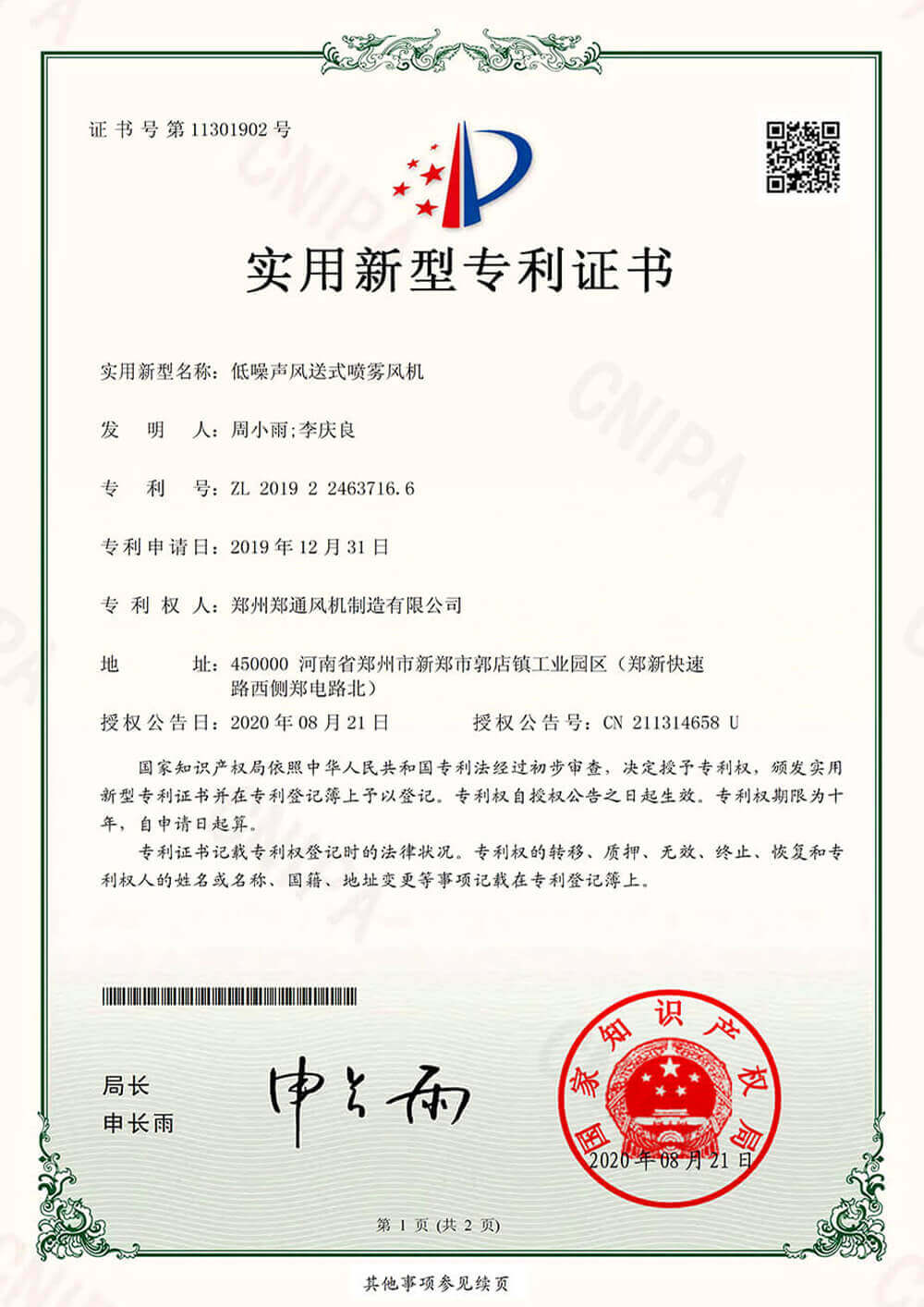 實(shí)用新型專(zhuān)利證書(shū)1低噪聲風(fēng)送式噴霧風(fēng)機(jī)實(shí)用新型專(zhuān)利證書(shū)